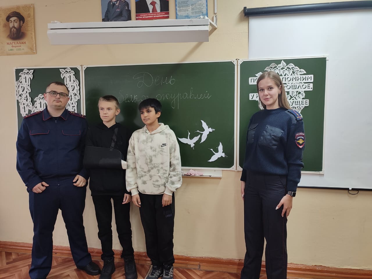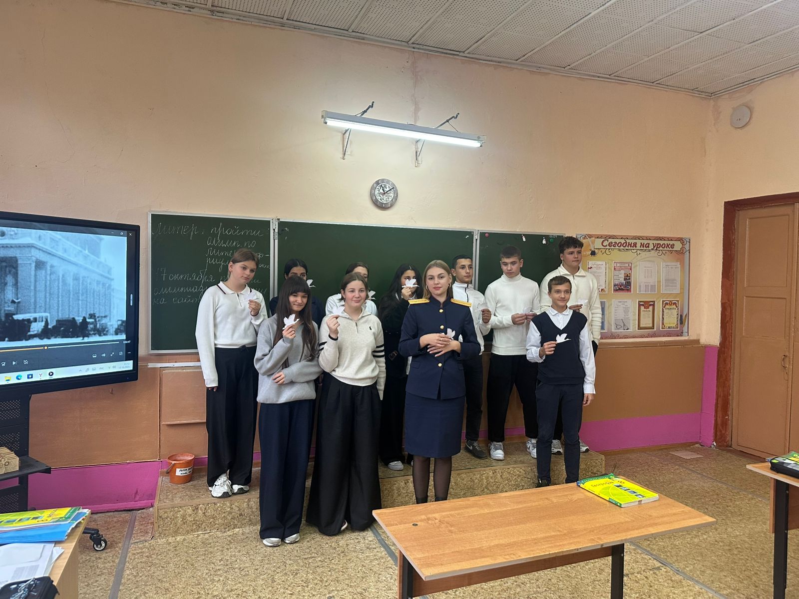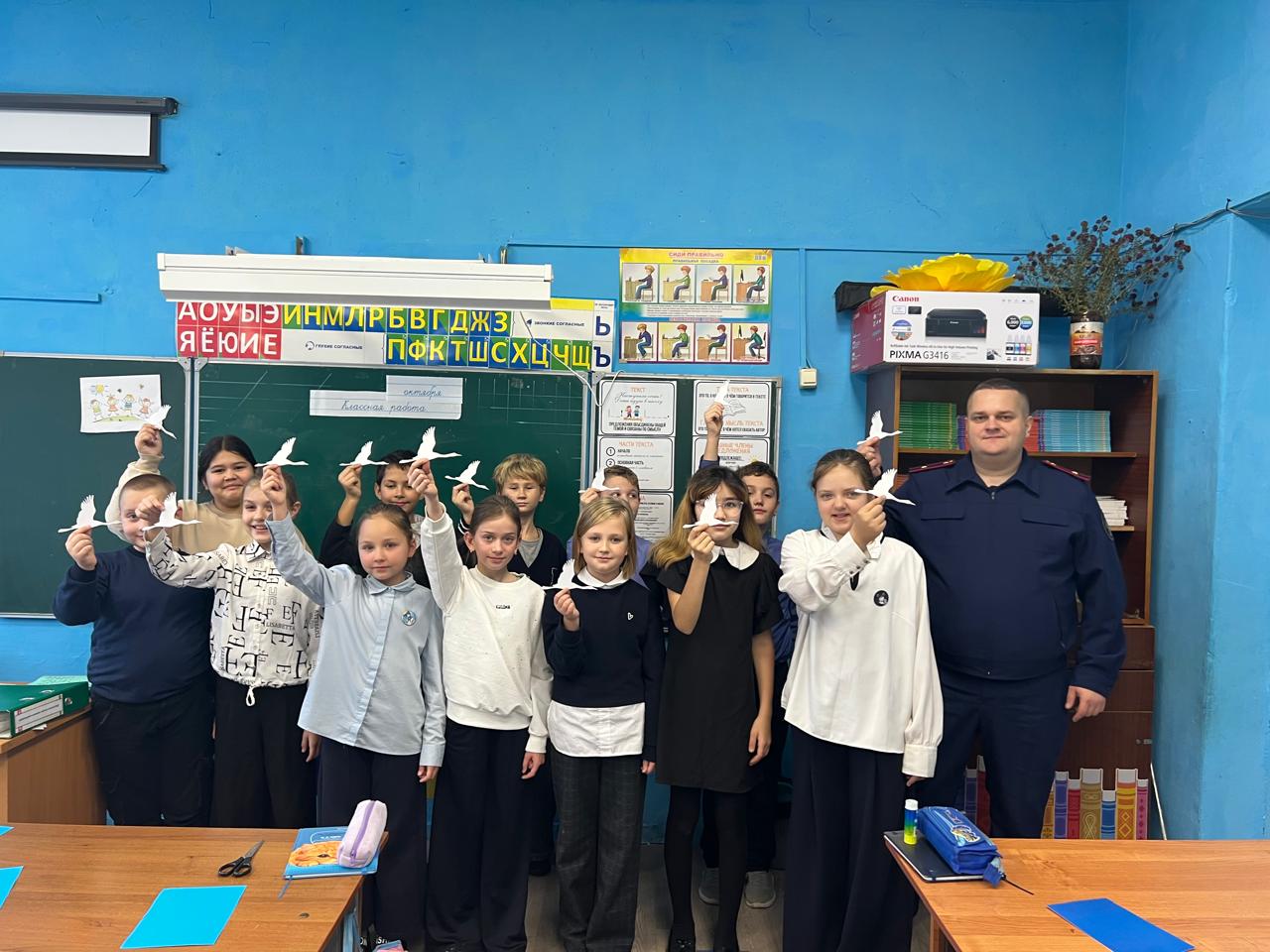 Вместе со следователями ребята вырезали из бумаги белых журавлей и посмотрели патриотические, а также приняли участие в возложении цветов к мемориалам, посвященным Великой Отечественной войне.