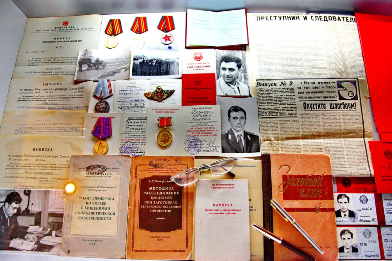 На выставке представлены вещи Г. Каданера – личные книги из библиотеки, методические рекомендации следователям, написанные им самим, портфель с которым он ходил на службу, авторучка.