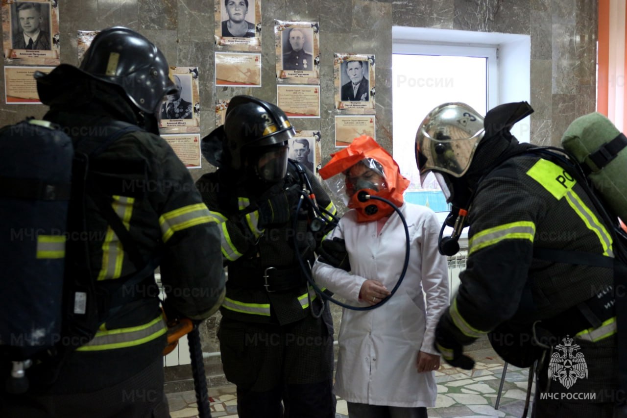 По легенде учений, в результате короткого замыкания в электропроводке пожар возник на втором этаже здания в столовой. В ходе тренировки спасателям было необходимо было найти «пострадавшего», вывести его на свежий воздух, а также найти источник возгорания и оперативно ликвидировать его. За считанные минуты к месту «пожара» прибыло подразделение 3 пожарно-спасательной части. Узнав о том, что в помещении остался человек, звеном газодымозащитной службы огнеборцы провели разведку в аппаратах для защиты органов дыхания и зрения по поиску «пострадавшего». Медработница была обнаружена на 2 этаже здания в столовой недалеко от очага возгорания. С помощью спасательного устройства сотрудники МЧС России вывели «пострадавшую» на свежий воздух, а далее оперативно ликвидировали условный пожар.