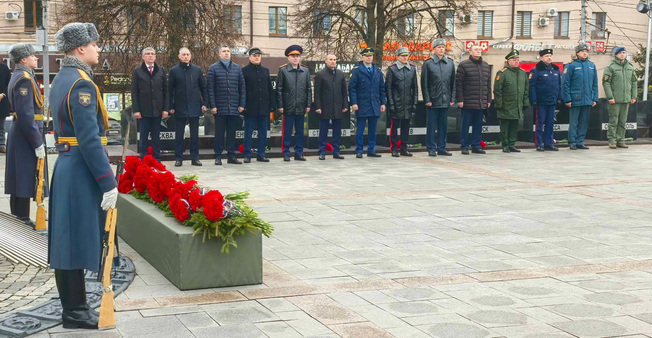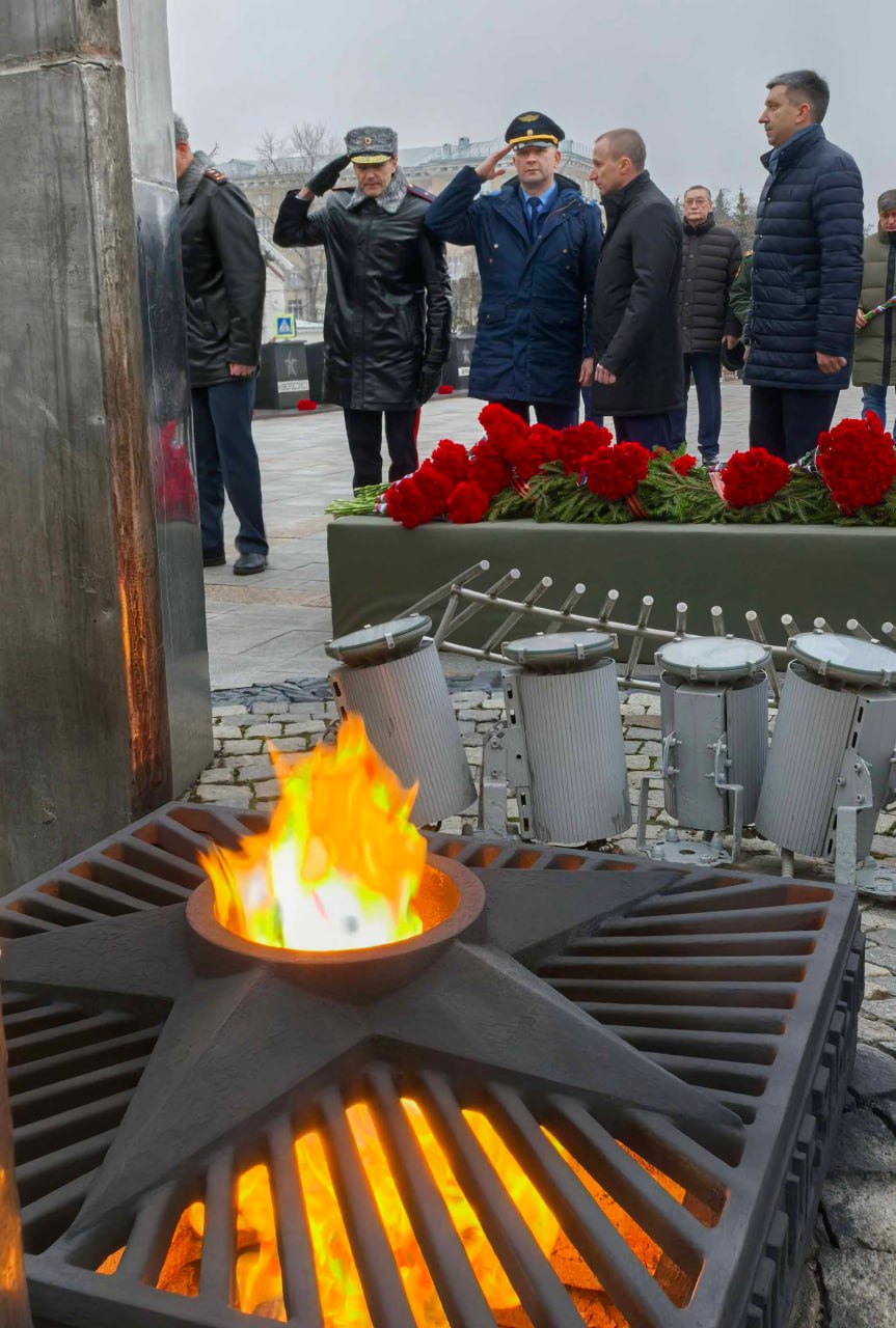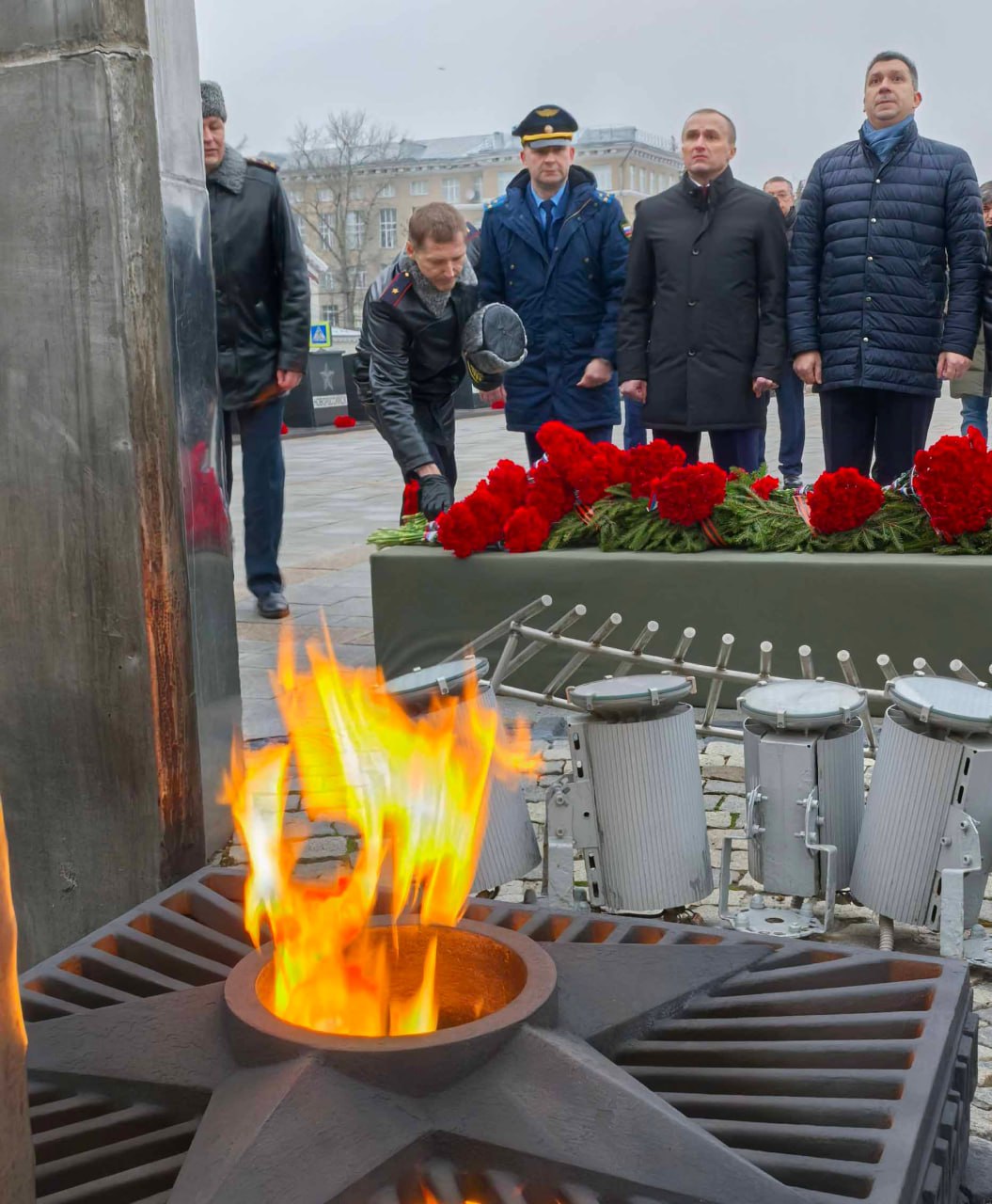 Участники церемонии возложили цветы к Вечному огню, символизирующему неугасаемую память о героях. В знак глубокого уважения и признательности подвигу, совершенному защитниками города-героя, собравшиеся почтили их память минутой молчания.