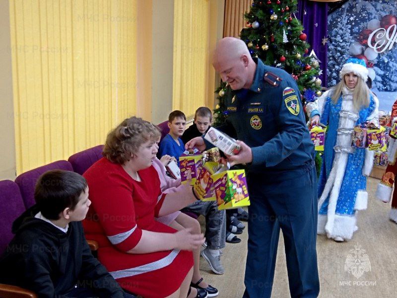Заместитель начальника отдела надзорной деятельности и профилактической работы по Узловскому, Киреевскому районам и города Донской Алексей Ерзаулов и заместитель прокурора города Донского Елена Скоропупова поздравили подрастающее поколение с Новым годом и Рождеством, а также вручили ребятам сладкие подарки.