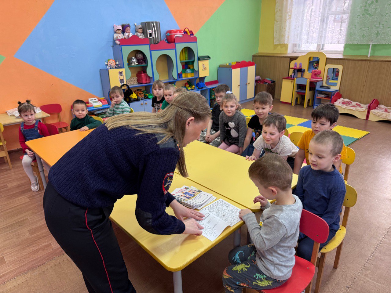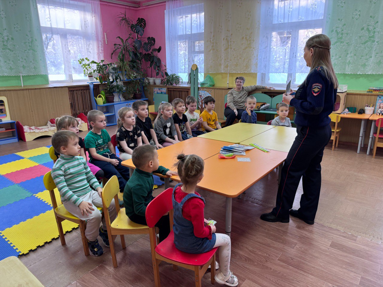 Вместе с автоинспектором дети вспомнили дорожные знаки, как правильно переходить дорогу и вести себя на пешеходном переходе.