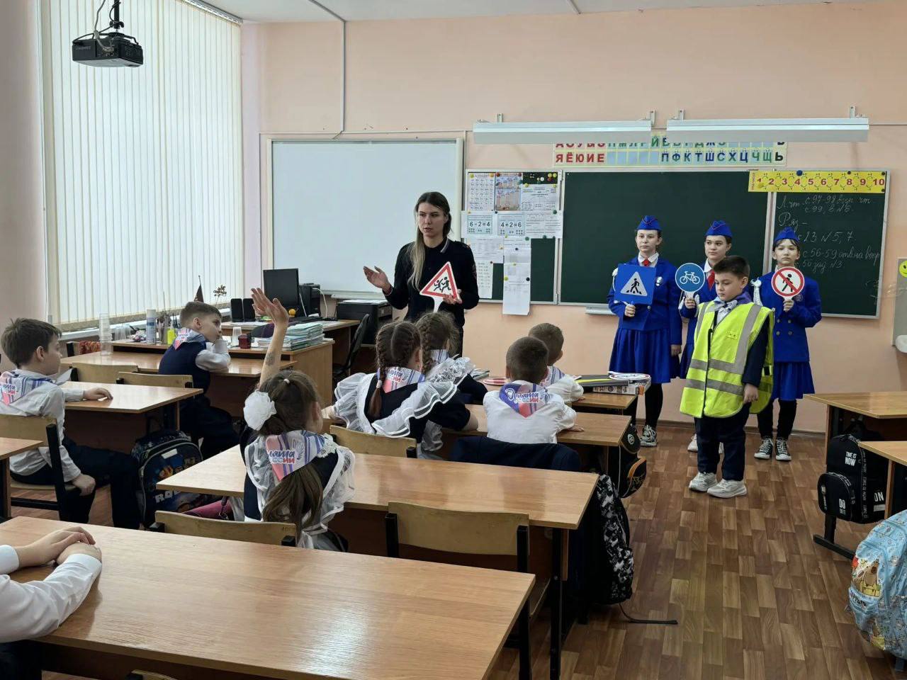 Инспектор по пропаганде БДД отдела Госавтоинспекции ОМВД России по городу Новомосковску Тульской области Виктория Серикова совместно с ребятами из отряда ЮИД провели уроки дорожной безопасности с учащимися начальной школы МБОУ «СОШ №2».