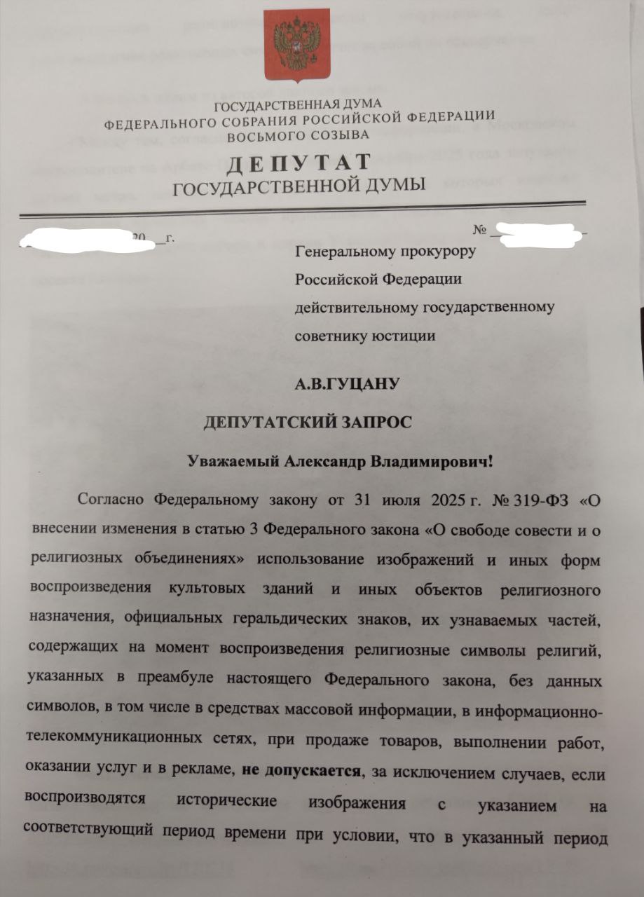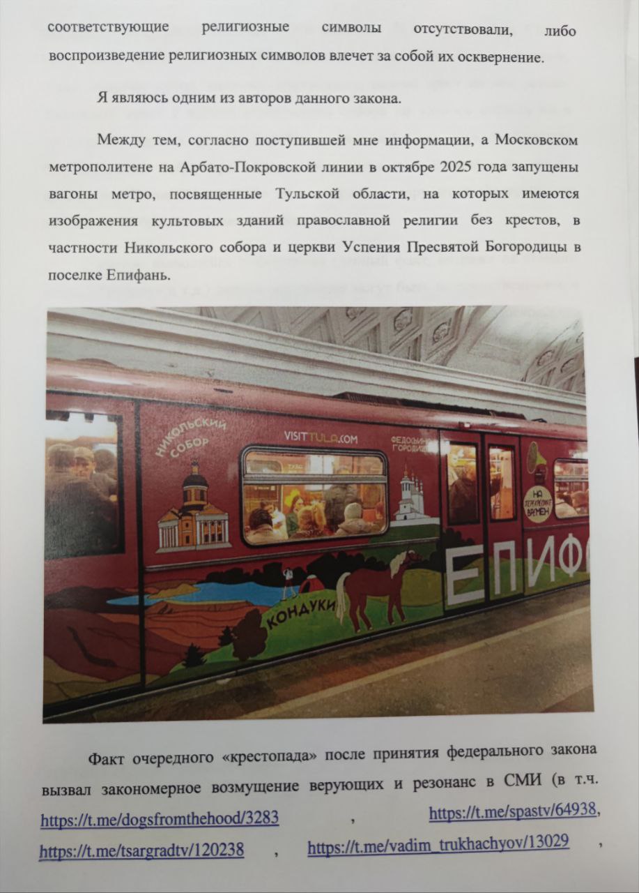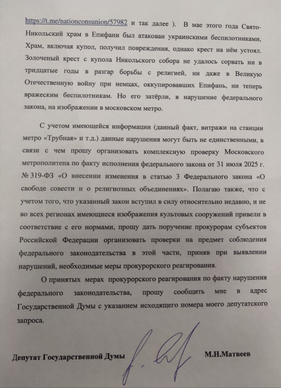 Направляю депутатский запрос Генеральному прокурору. С учётом того, что факты "крестопада" продолжаются то здесь , то там, уже после принятия закона, прошу Генпрокурора не только провести проверку московского метрополитена, но и дать поручение прокурорам субъектов РФ провести проверку соблюдения принятого закона на их территориях, приняв при выявлении нарушений меры прокурорского реагирования.