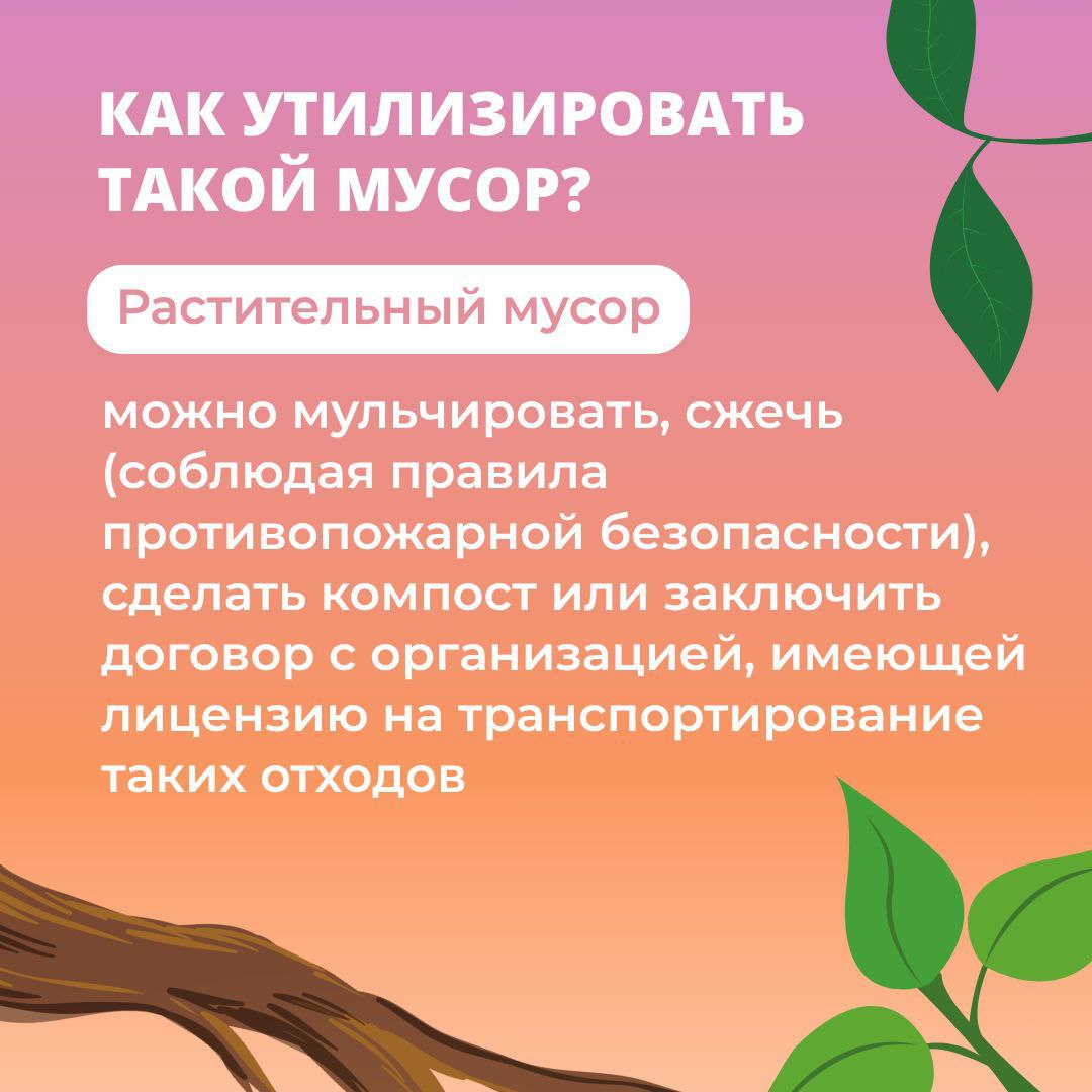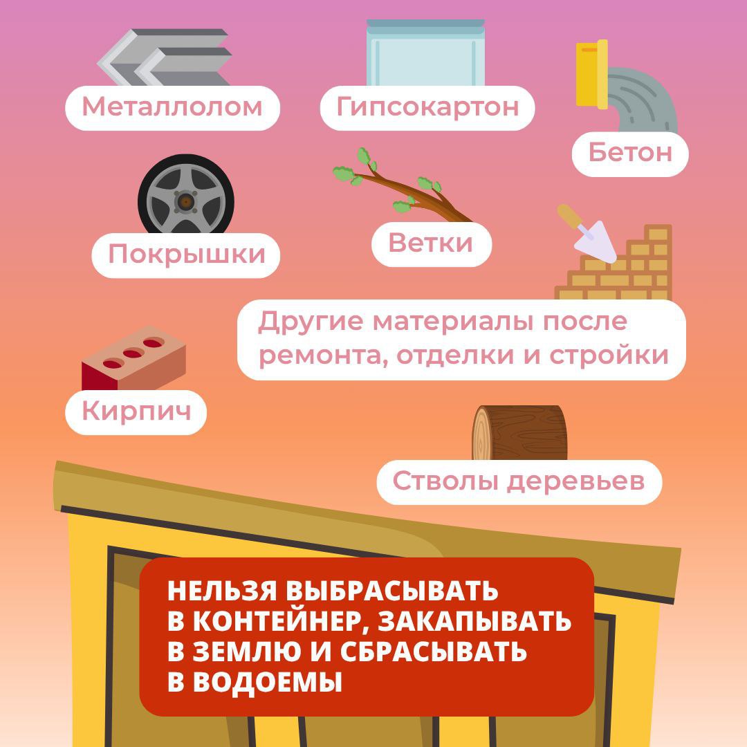 Строительные, растительные отходы и покрышки нельзя выбрасывать в мусорные контейнеры или оставлять в безлюдных местах.