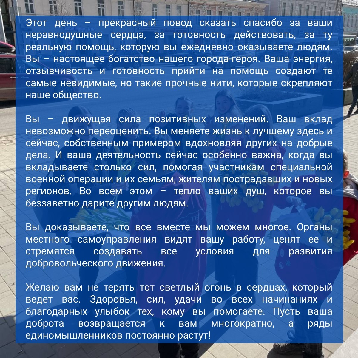 Добрые, бескорыстные и отзывчивые Сегодня говорим «спасибо» тем, кто меняет жизнь к лучшему не по обязанности, а по зову сердцаВ День добровольца благодарю за работу наших волонтеров. Благотворительная деятельность, поддержка участников СВО и...