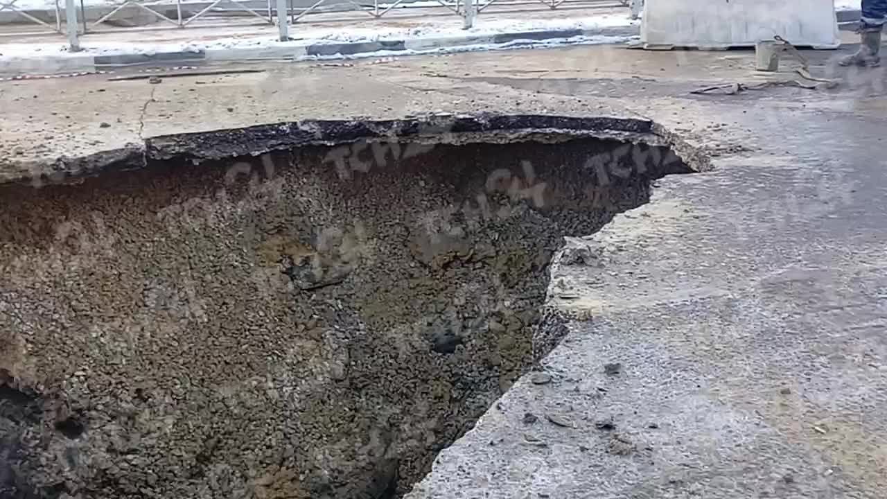 Провал асфальта произошел сегодня утром. Оказалось повреждено около 10 квадратных метров дорожного полотна. Без воды остались 6 многоквартирных домов, включая школу и детский сад.