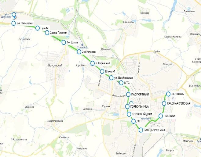 В маршрут входят следующие остановки: Цех-12, Завод «Пластик», 4-я Шахта, 2-я Узловая, Поселок Горняцкий, Шахта-1, Улица Воейковская, МТС, Паспортный, Горбольница, Торговый дом, ДК, Завод «Кран-УМЗ», Чкалова и Красная Узловая.