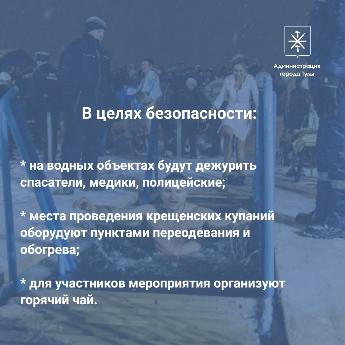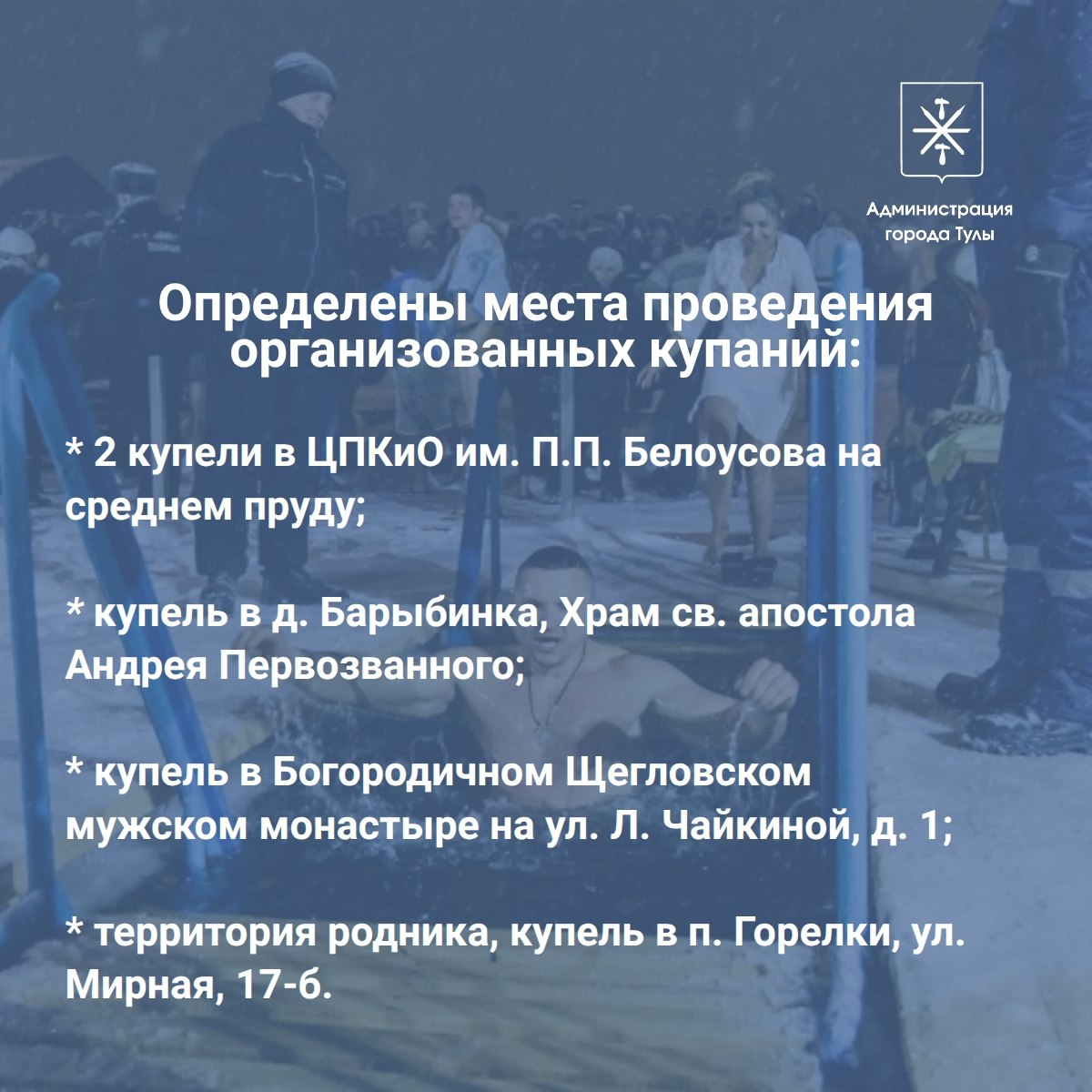 Как будут организованы крещенские купания в Туле?Провел совещание по этому вопросу. В ночь с 18 на 19 января в городе будут организованы 4 места для крещенских купаний:- 2 купели в ЦПКиО им. П.П. Белоусова на среднем пруду;- купель в д. Барыбинка...