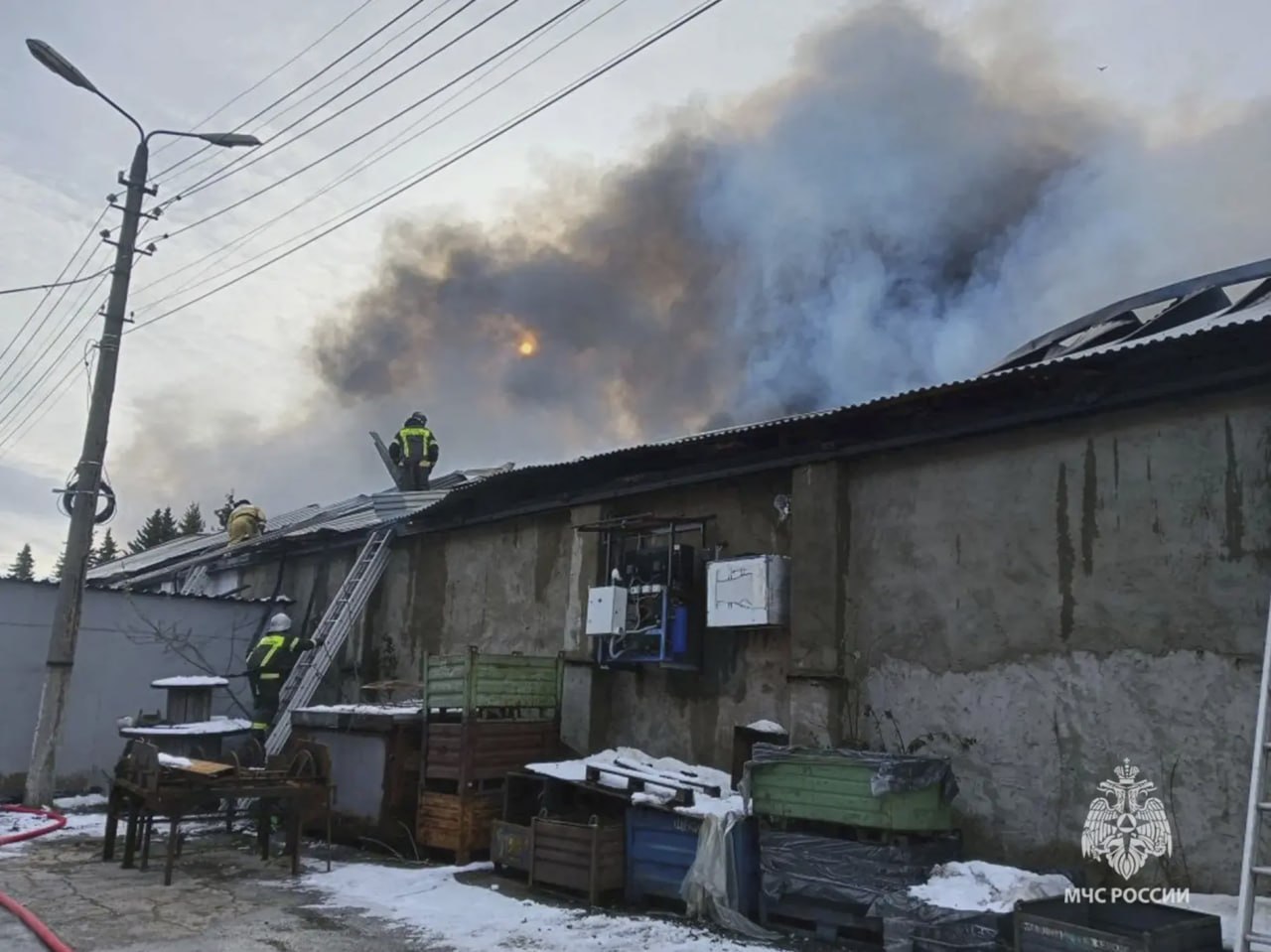 На фото видно огромное облако дыма, которое поднимается над горящим объектом.