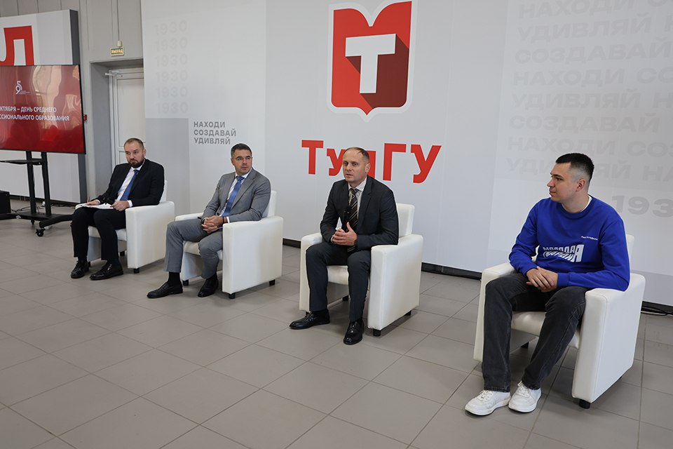 Глава города Тулы Алексей Эрк, депутат Тульской городской Думы, заместитель директора института права и управления ТулГУ, заместитель председателя «Молодой Гвардии Единой России» Никита Бурвиков, депутат гордумы, руководитель регионального отделения «Молодой Гвардии Единой России» Павел Астафьев встретились со студентами института права и управления ТулГУ, которые проходят обучение по программам среднего профессионального образования, а также с преподавателями университета.