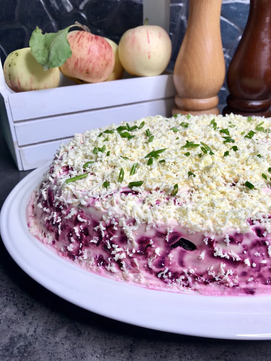 Следующим будет слой свеклы, которую нужно натереть на крупной терке и отжать, чтобы избавиться от лишней влаги, иначе салат может быть слишком жидким. После укладки свеклы, смажьте ее майонезом, а затем повторите все слои для более насыщенного вкуса. Завершите композицию тертым яичным желтком и зелёным луком для декора.