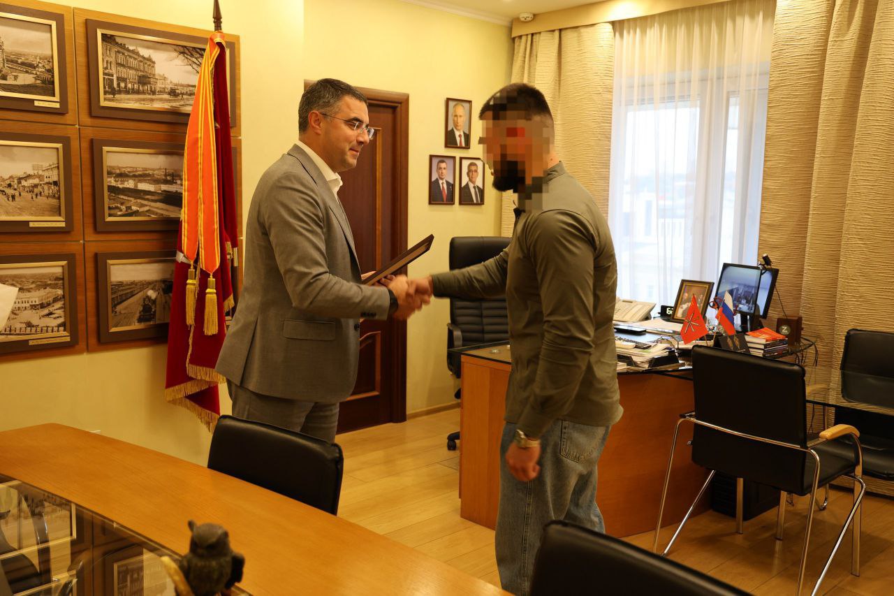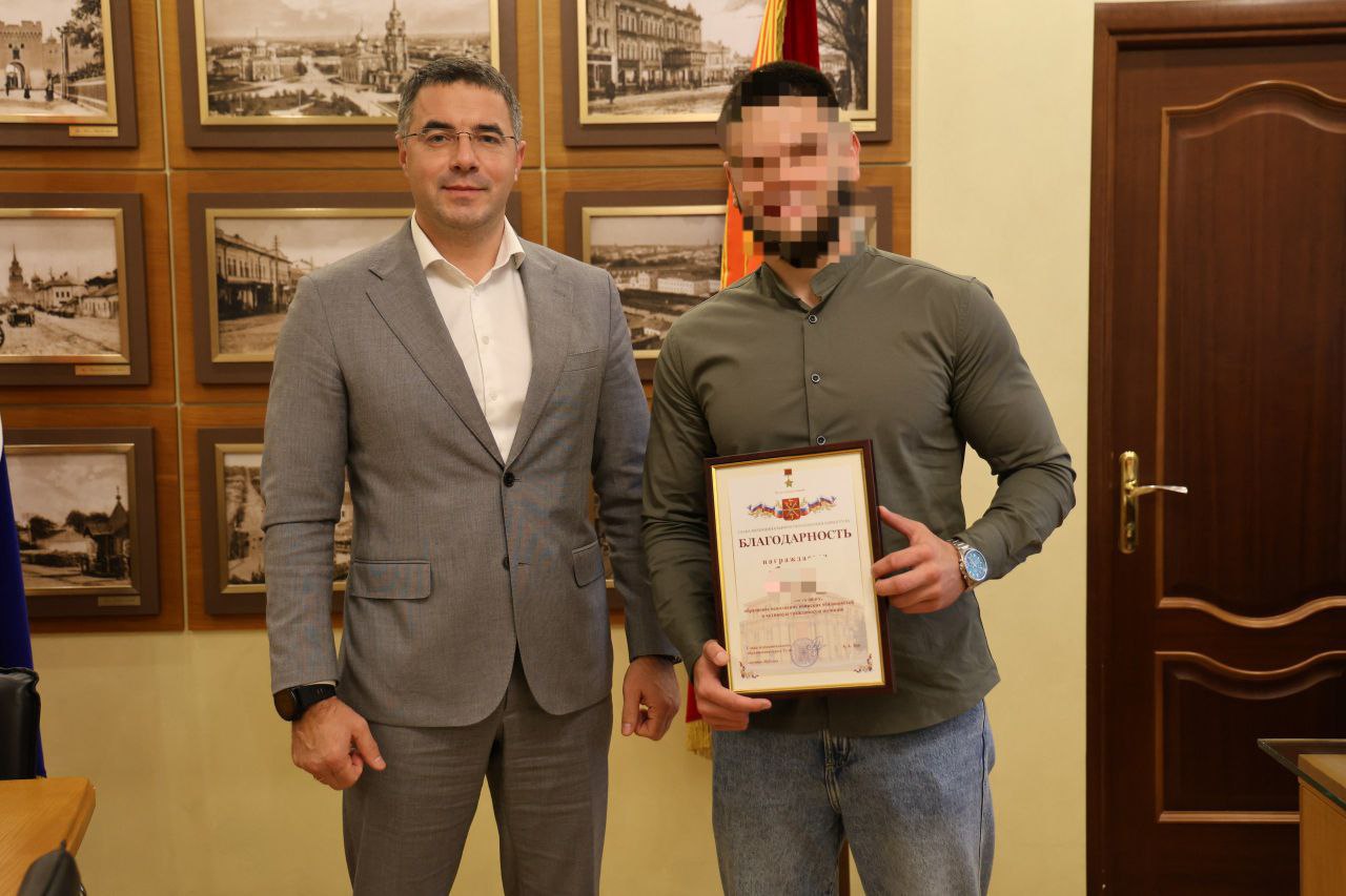 Глава города Тулы Алексей Эрк передал гвардии ефрейтору, участнику спецоперации, ветерану боевых действий Андрею с позывным «Ураган» Благодарность.