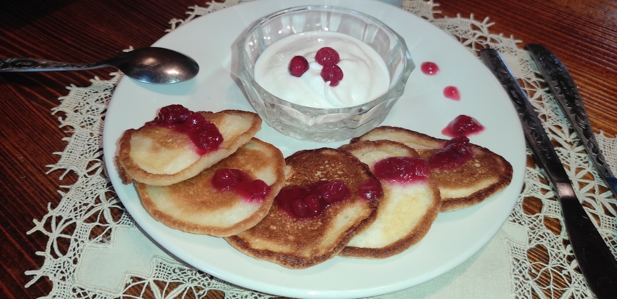 Теперь тесто необходимо оставить в теплом месте на полчаса. В это время оно должно увеличиться в объеме и начать пузыриться — это сигнал о том, что можно жарить. Разогрейте сковороду и обжаривайте оладьи с обеих сторон до золотистой корочки. Такой легкий и аппетитный завтрак можно подать со сметаной и брусничным соусом, который добавит сочности и ярких ягодных нот.