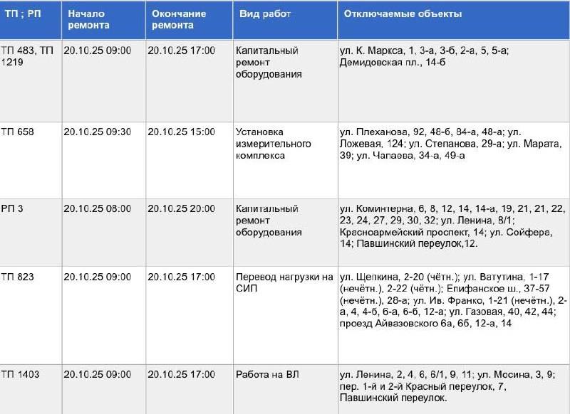 Опубликован список адресов, по которым завтра, 20 октября, в Туле не будет электроэнергии