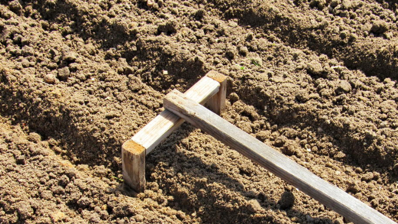 При посадке ямки нужно делать глубиной 5-8 см, оставляя расстояние в ладонь между зубчиками и в две ладони между рядами. Для удобства можно использовать заостренный колышек или специальный конус. Очень важно не перепутать стороны: сажать надо донышком вниз, а остриями вверх. После посадки землю слегка уплотняют и поливают, особенно если осень выдалась сухой.