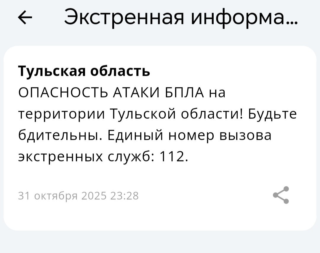 - ОТБОЙ опасности атаки БПЛА на территории Тульской области! Единый номер вызова экстренных служб: 112. Актуальная информация, советы по безопасности и связь со службами спасения — в приложении МЧС. Ссылки на скачивание здесь: vk.cc/cHf0Zz// Тульская область