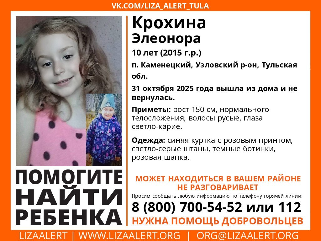 Как сообщает поисковый отряд «Лиза Алерт» Тульской области, десятилетняя Элеонора Крохина вышла из дома 31 октября и не вернулась.