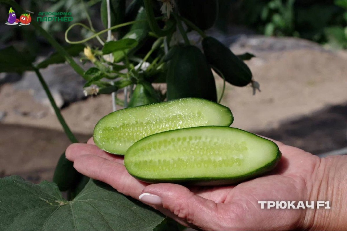 - ТРЮКАЧ F1 — миниатюрное растение с крупнобугорчатыми плодами длиной 8-10 см. Эти огурцы отличаются сочностью и ароматом.