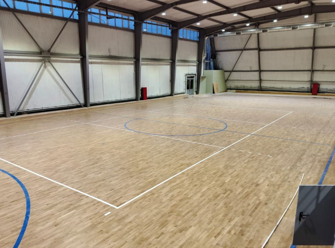 Готовность объекта - 97 %. Здесь заменили кровлю, фасад и инженерные коммуникации, выполнили перепланировку помещений и обновили все спортплощадки внутри и возле комплекса. Благоустроена входная группа и выполнено озеленение. Сейчас идет установка трибун. Завершить работы должны до конца ноября.