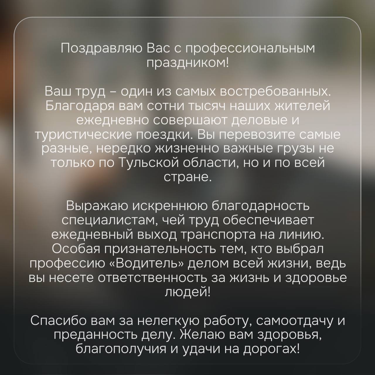 — Ваш труд – один из самых востребованных. Благодаря вам сотни тысяч наших жителей ежедневно совершают деловые и туристические поездки. Вы перевозите самые разные, нередко жизненно важные грузы не только по Тульской области, но и по всей стране.