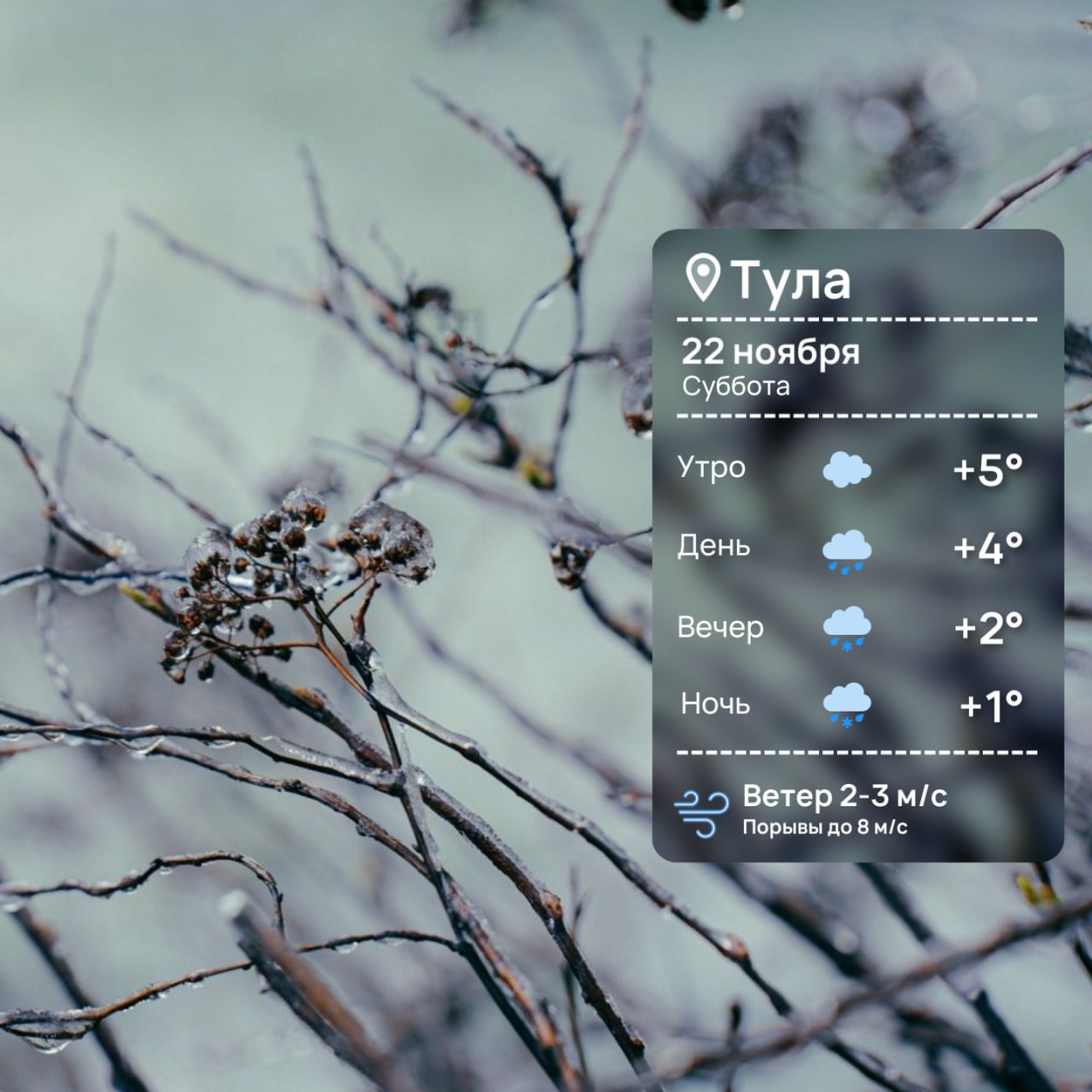 Погода на 22 ноября Время рассвета: 08:10.Время заката: 16:20.Световой день: 8 ч. 10 мин.Температура воздуха: -+4°C (днем), +1°C (ночью).Дождь со снегом.Геомагнитная обстановка: спокойная.ТСН24 | Прислать Новость | Мы в МАХ