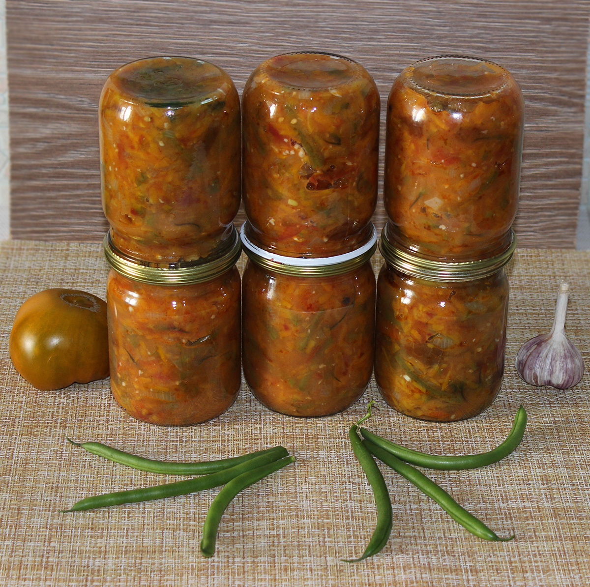 Затем в кастрюлю добавить спаржевую фасоль, перец и помидоры, перемешать и тушить ещё 40 минут. За 15 минут до окончания приготовления добавить чеснок и специи, а в конце всыпать растворённую лимонную кислоту. Перемешать и тушить ещё 5 минут. Готовый салат раскладывается по стерилизованным банкам и закатывается крышками.