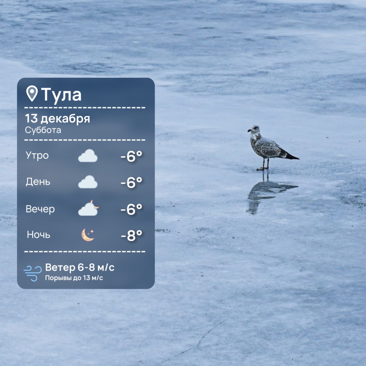 На 13–14 декабря синоптики предсказывают днём около 4 °C, ночью — до 7 °C. Новые осадки в виде снега возможны в ночь с субботы на воскресенье с вероятностью примерно 65%.Ветер будет умеренным (3–6 м/с), давление — в районе 739–745 мм рт. ст. Местным...