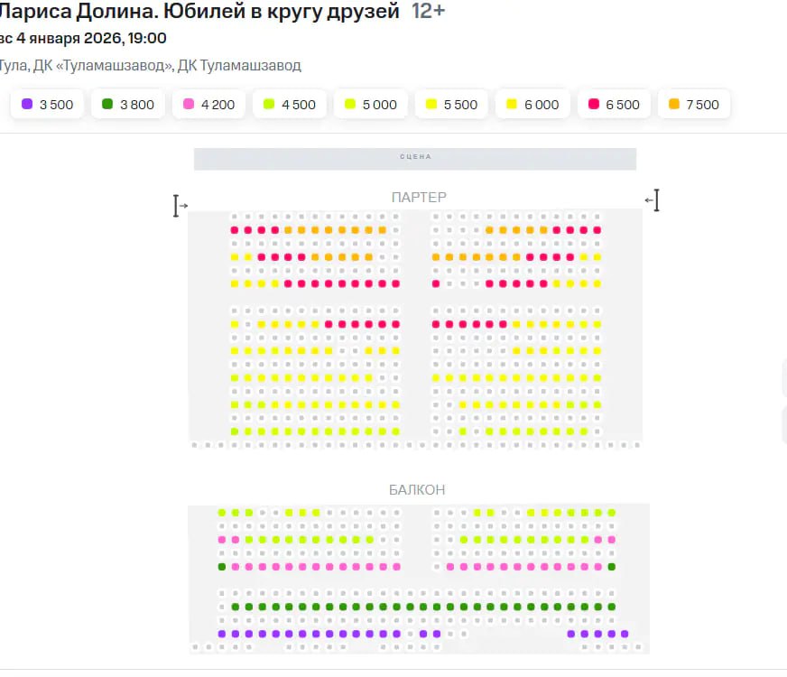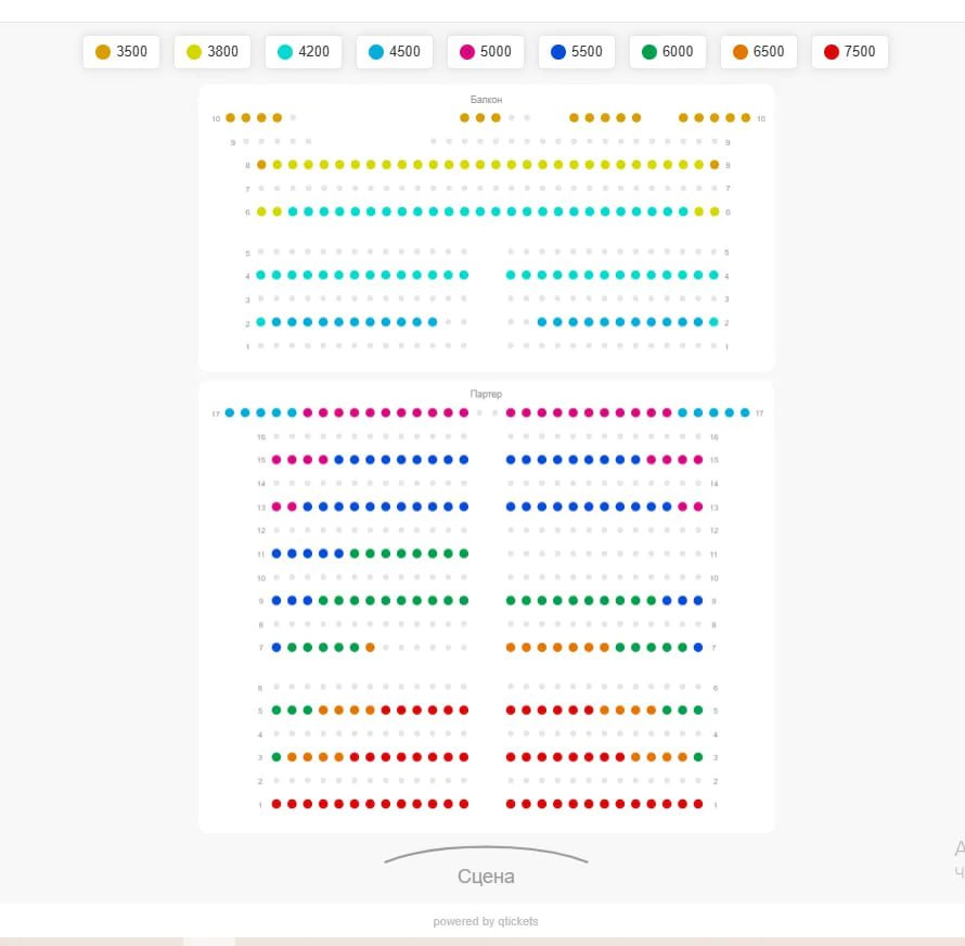 Пройдя на сайт «Туламашзавода», мы находим афишу мероприятия. Для покупки билета сайт перенаправляет нас на платформу qtickets.ru. Там мы видим, что для покупки доступны билеты на нечетных рядах (1 фото).