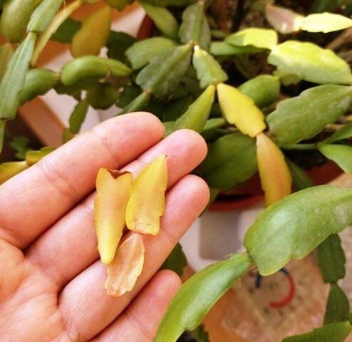 - Лишний солнечный свет: Декабрист — обитатель тропических лесов Бразилии, и он плохо переносит прямые солнечные лучи. Если растение находится на солнцепёке, его сегменты начинают желтеть, а затем опадают. Это бедствие произошло из-за расположения на солнечной лоджии, где условия для развития не всегда идеальные, из-за чего цветок испытывает стресс.
