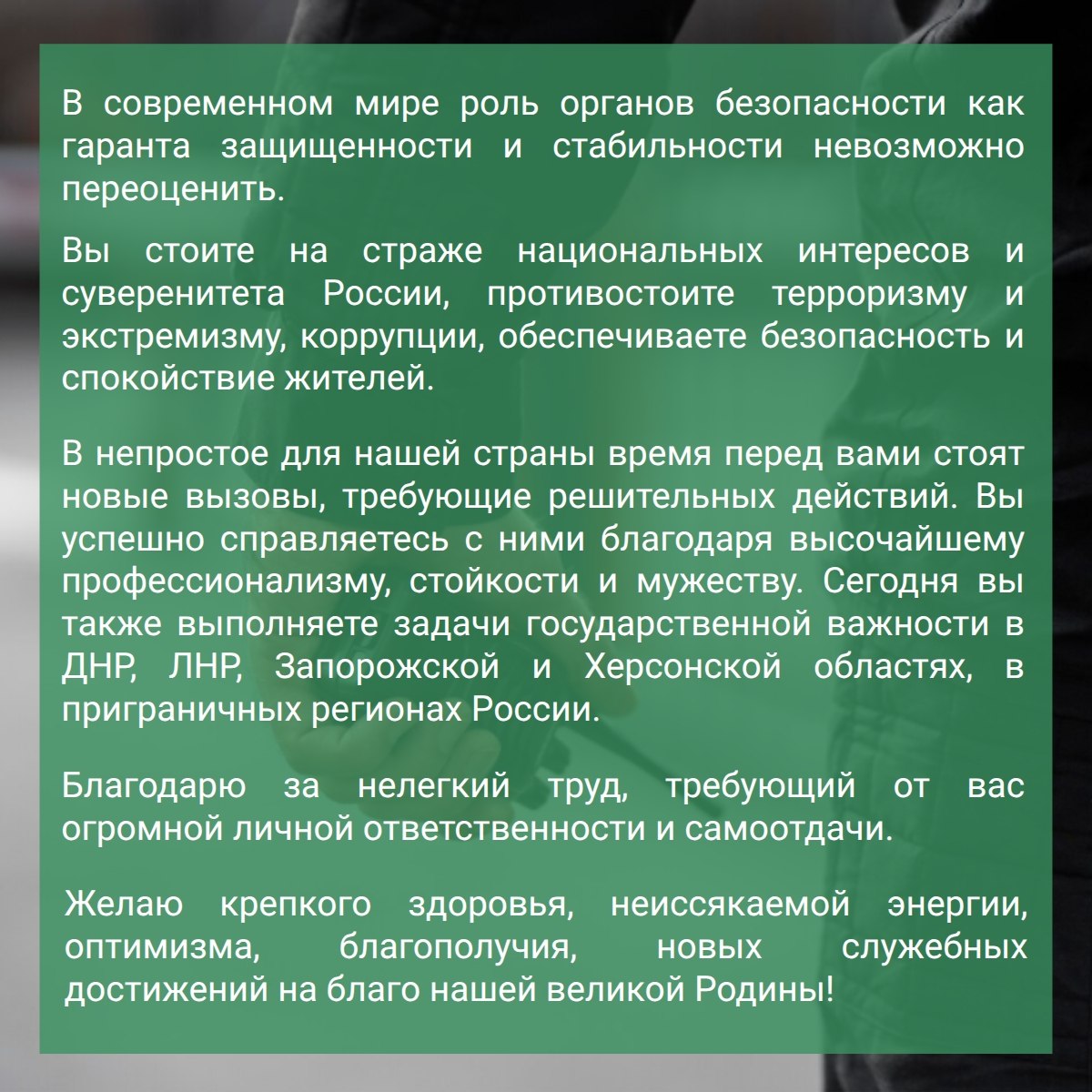 В современном мире роль органов безопасности как гаранта защищенности и стабильности невозможно переоценить.Вы стоите на страже национальных интересов и суверенитета России, противостоите терроризму и экстремизму, коррупции, обеспечиваете безопасность...