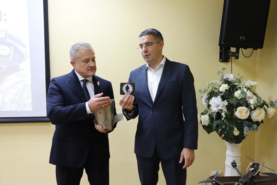 Алексей Эрк передал в музей экспонат, привезенный с передовой, и шеврон разведроты 51-го гвардейского парашютно-десантного полка.