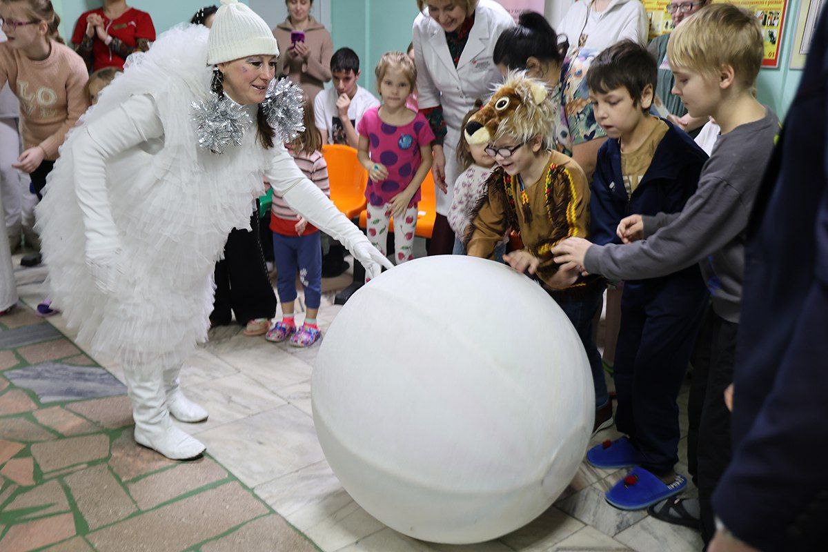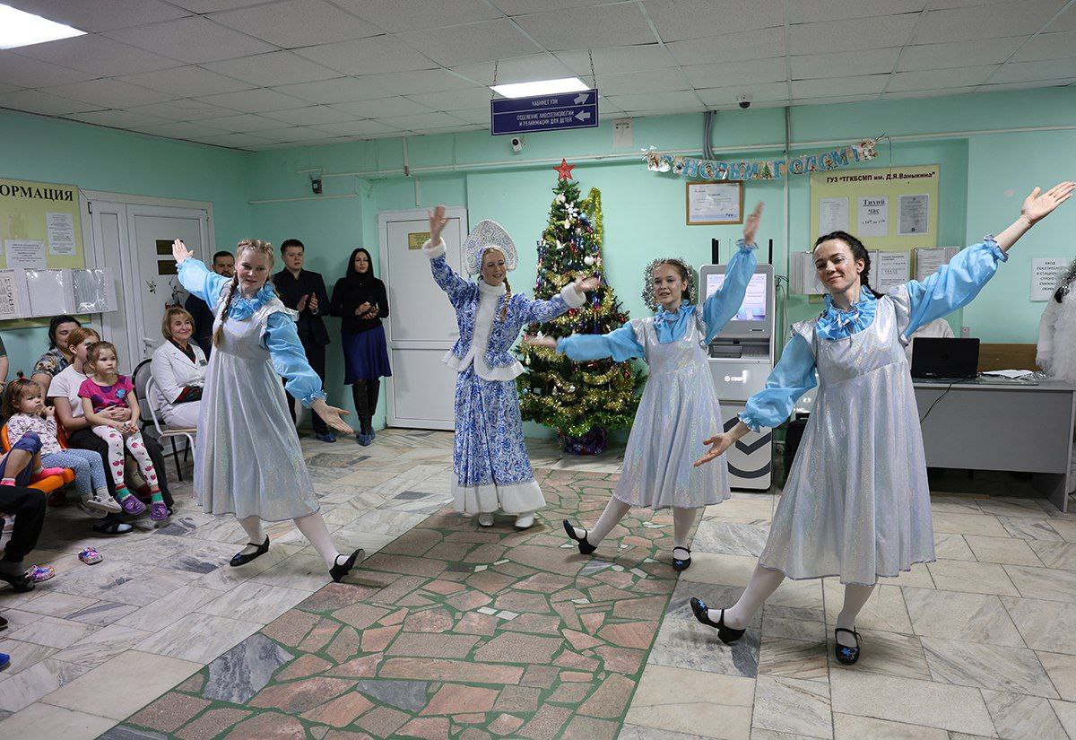 Для ребят, проходящих лечение, было организовано новогоднее представление с участием Деда Мороза, Снегурочки, играми и хороводами. В завершении программы все дети получили сладкие подарки.