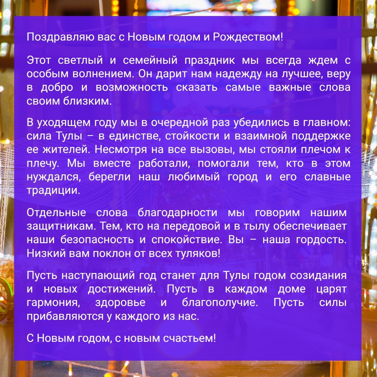 Глава администрации Тулы Илья Беспалов поздравляет жителей города с наступающим Новым годом и Рождеством Христовым