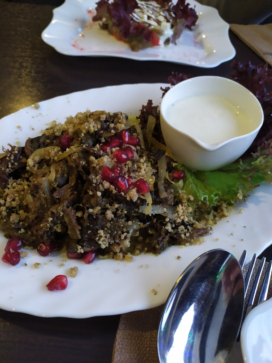 В меню представлены разнообразные блюда: хинкали с телятиной, овощная тарелка и различные салаты. Хинкали заслуживают похвалы – они большие и сочные, с нежным мясом, однако другие блюда из меню вызвали больше вопросов. Салат авелук оказался на высоте благодаря идеально подобранным ингредиентам, но вот салат с печеными овощами и бочковые соленья, к сожалению, поразили лишь невзрачностью.