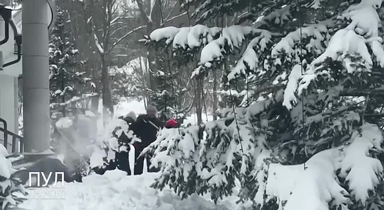 Засыпает не только нас, но и Белоруссию. С лопатой вышел даже сам президент Лукашенко с сыном.