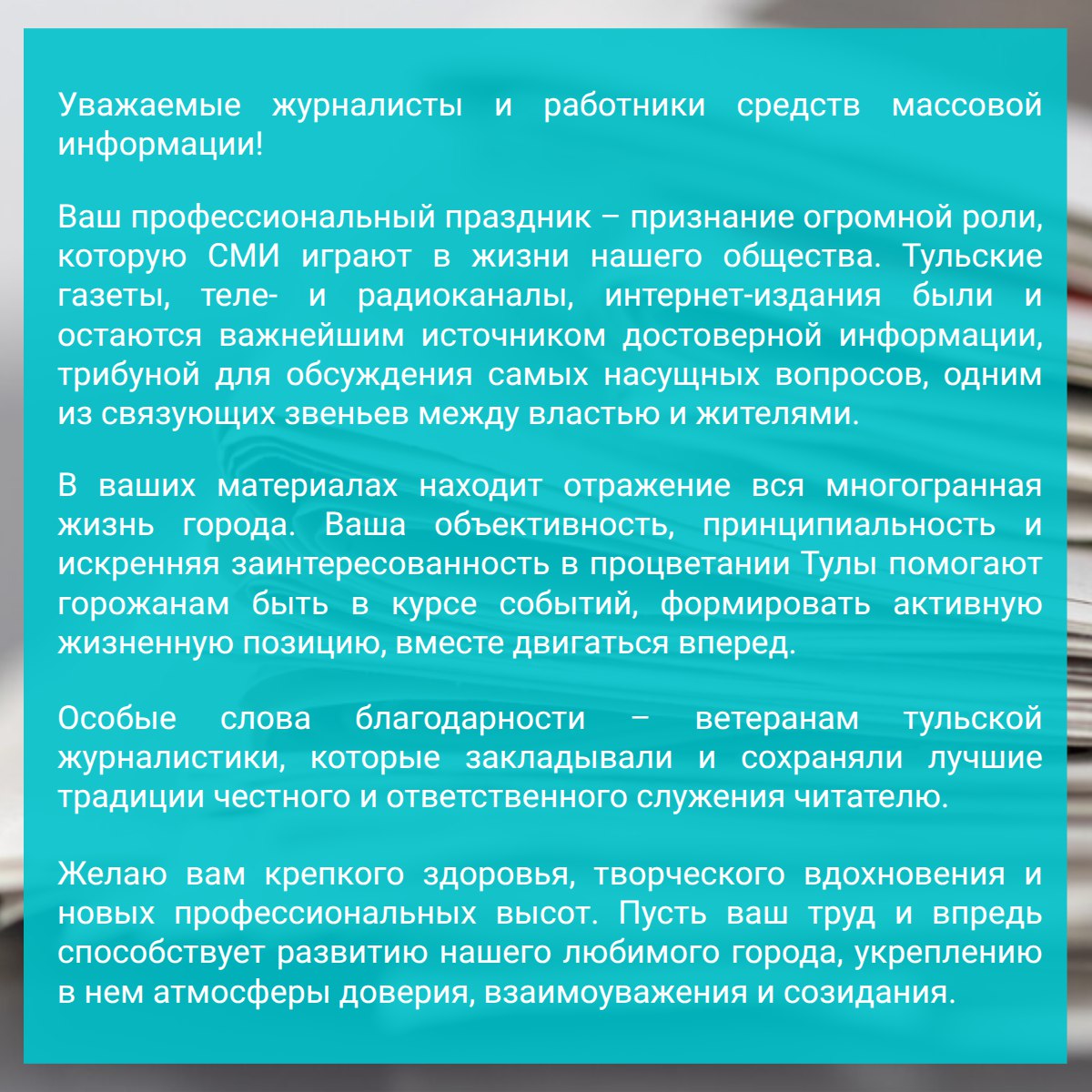 Ваш профессиональный праздник – это признание огромной роли, которую СМИ играют в жизни нашего общества. Тульские газеты, теле- и радиоканалы, интернет-издания были и остаются важнейшим источником достоверной информации, трибуной для...
