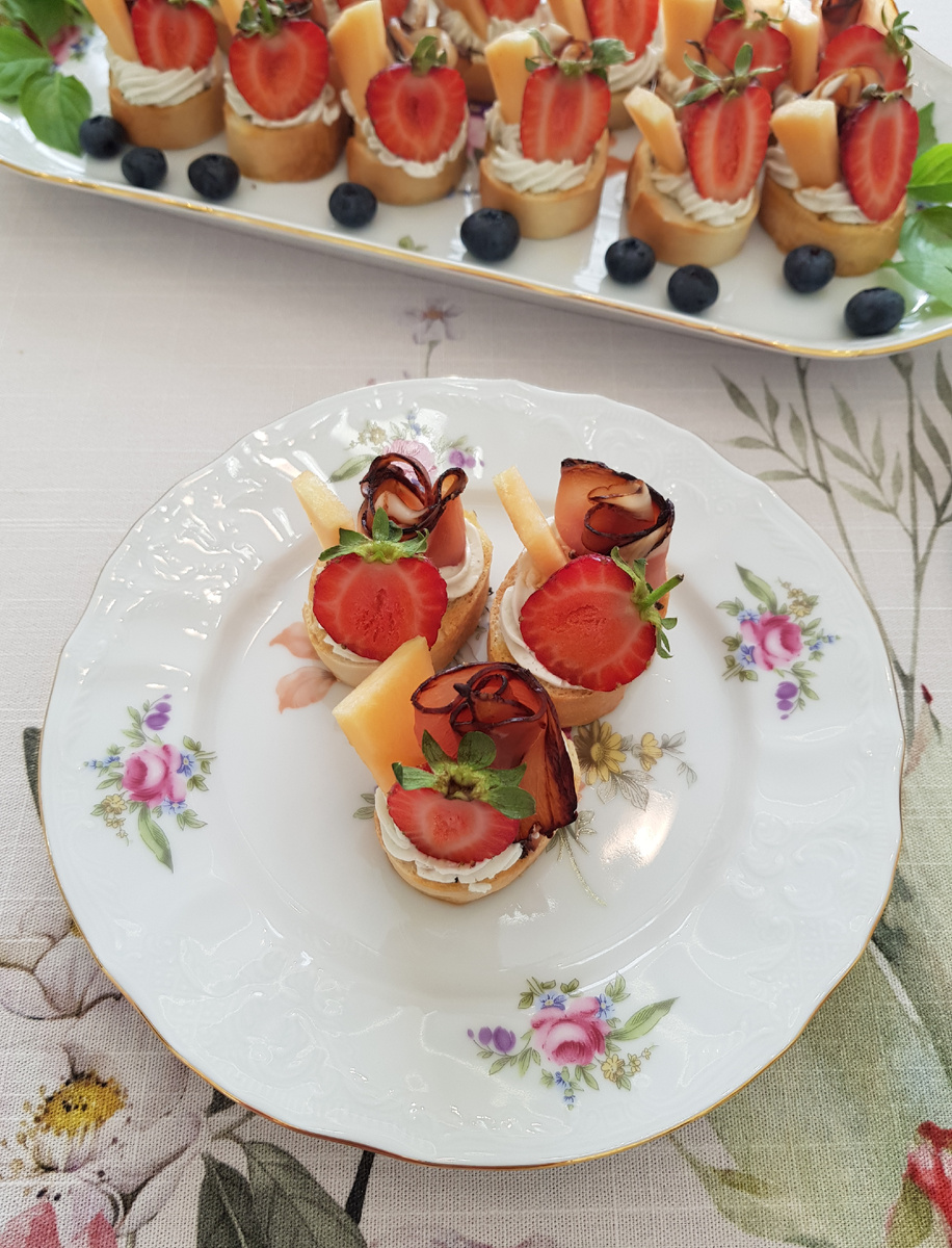 Каждый ломтик прошутто необходимо разрезать вдоль, а затем свернуть в изящные розочки, которые вставляются в сырную начинку. Дыню нарезают тонкими ломтиками и так же витковыми формами вставляют в закуску. Клубнику можно просто разрезать пополам и разместить на кростини.