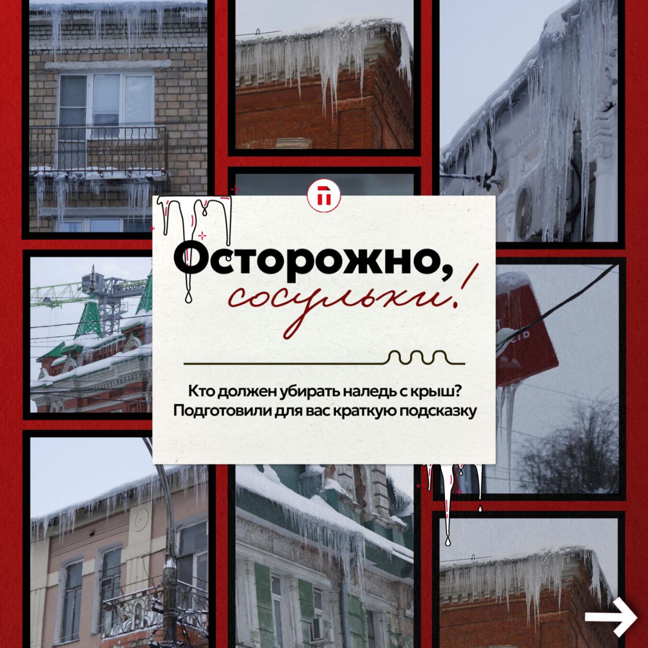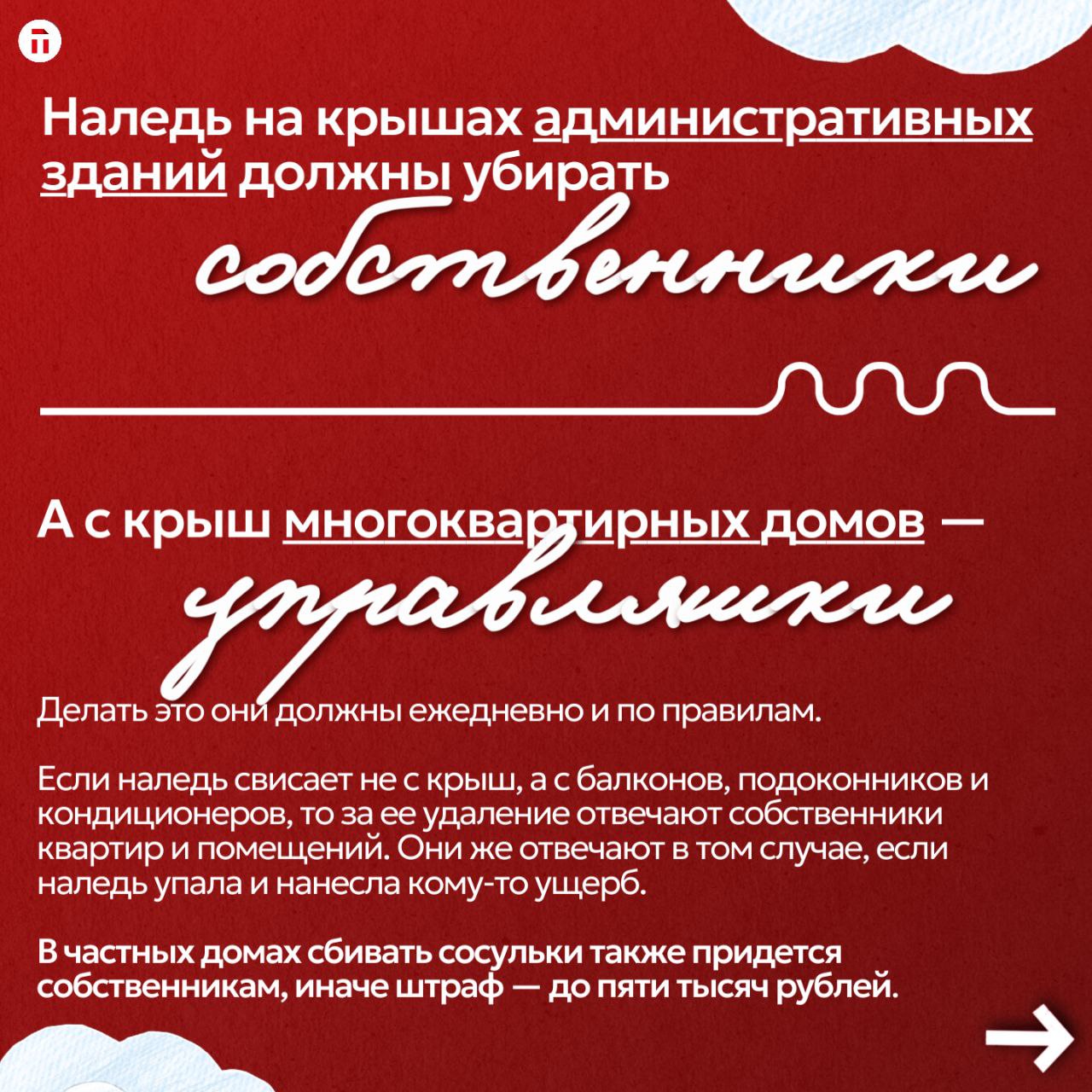 А в карточках собрали для вас информацию о том, кто должен убирать наледь с крыш и куда пожаловаться в случае чего.