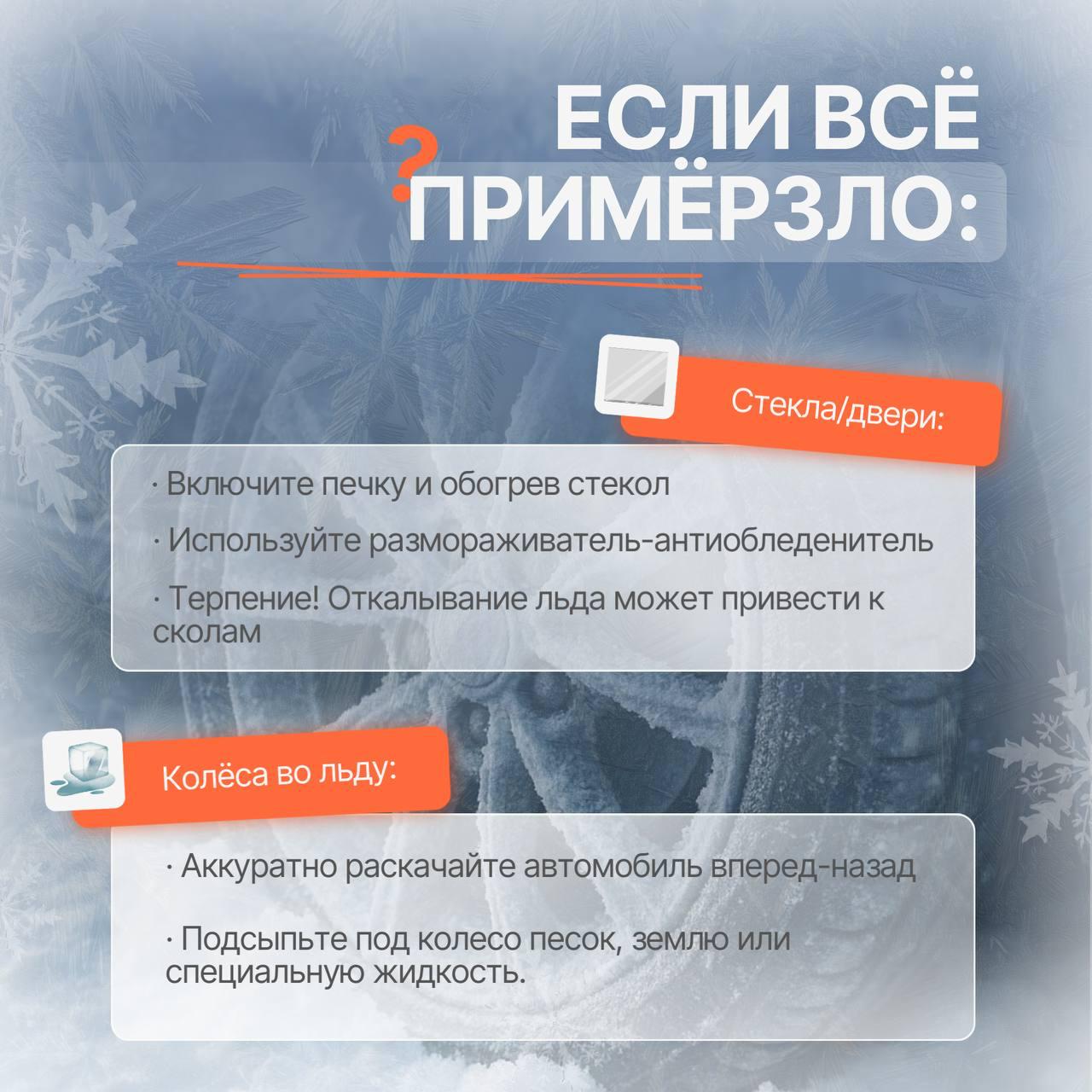 Используйте печку, обогрев стекол и размораживатель. Для колёс во льду — аккуратная раскачка.