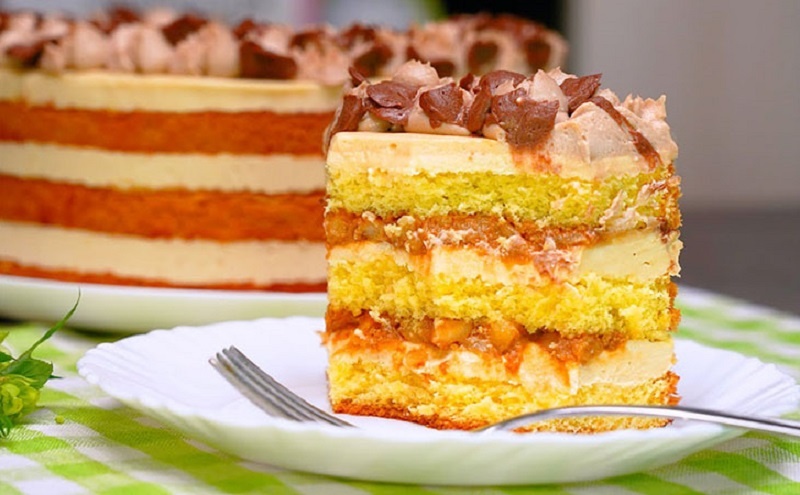 Когда базовый крем остынет, сливочное масло взбивается до пышности, и по частям вводится яблочная масса. Такой крем получается удивительно нежным и идеально подходит для прослойки тортов. Бисквит нужно разрезать на три коржа и пропитать смесью из воды, сахара и лимонного сока. На первый корж выкладывается крем и начинка, после чего добавляются остальные слои.