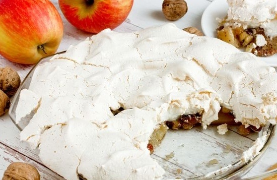 Когда яблоки будут готовы, достаньте форму из духовки и аккуратно выложите взбитые белки на яблоки. Затем снова поместите форму в духовку и запекайте ещё 15-20 минут при температуре 150 градусов.