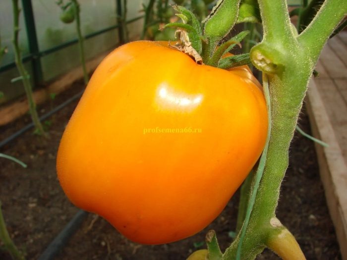 Плоды отличаются разнообразной формой — от сливовидной до кубовидной, весом от 200 до 400 граммов. Зрелые плоды имеют приглушённый оранжевый цвет, часто с румянцем или полосами. Они идеально подходят для приготовления салатов и соусов благодаря высокому содержанию сахаров и уникальному вкусу. Чем больше времени плоды проведут на растении, тем насыщеннее и выразительнее будет их вкус.