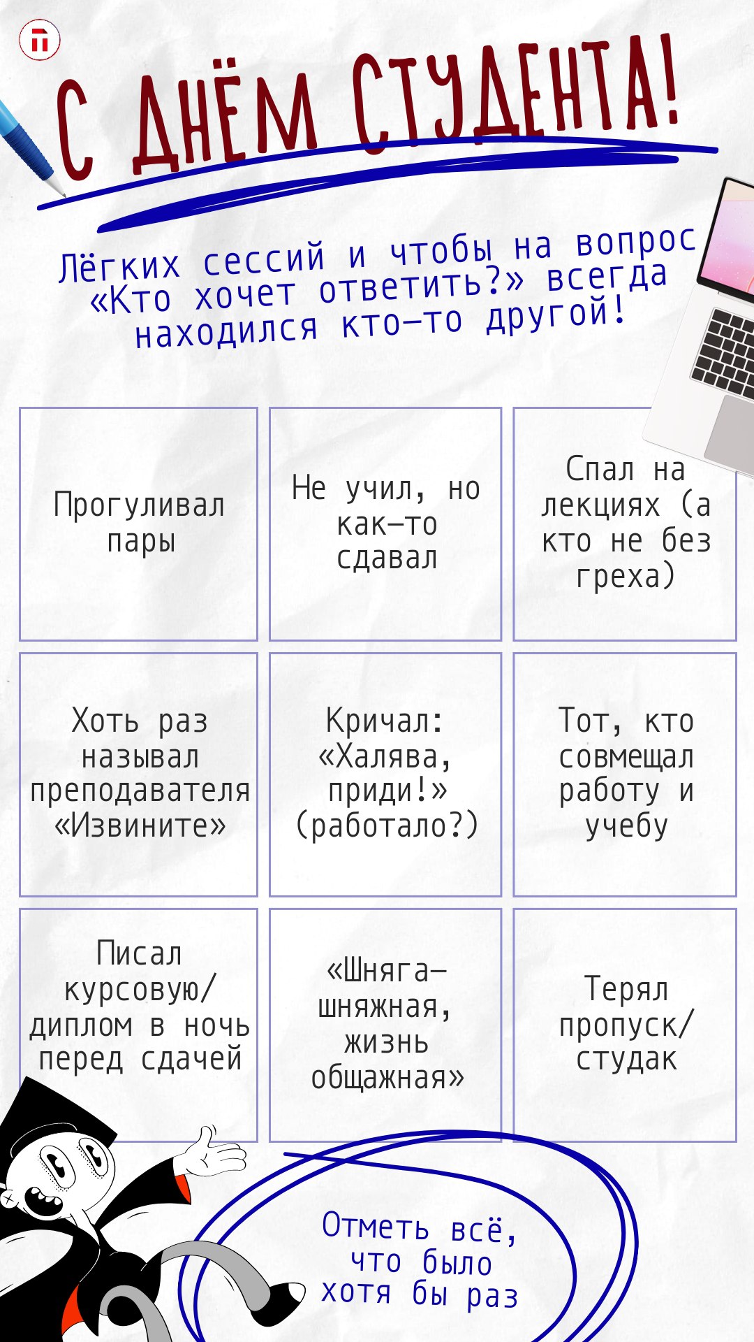Поздравляем всех с праздником! В честь этого предлагаем сыграть в «Бинго». В карточке собраны ситуации, с которыми вы наверняка сталкивались в студенческие годы.