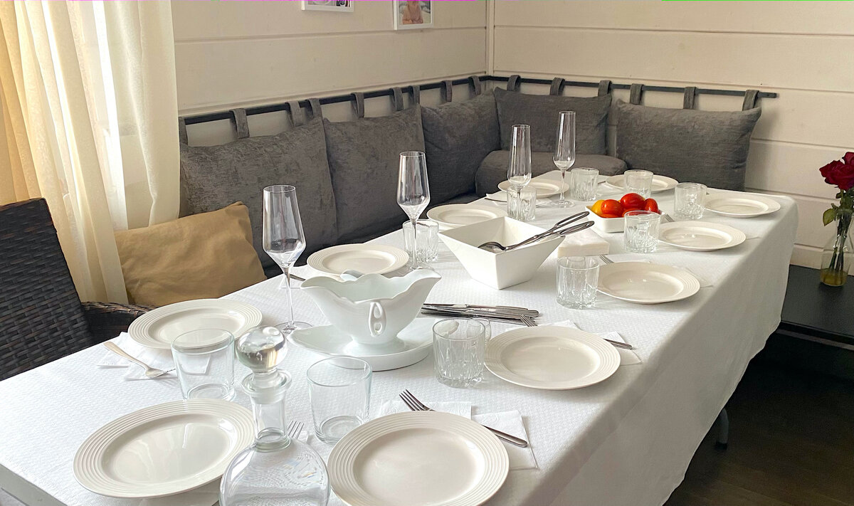 Обычно для таких встреч выбирается беседка, но в этот раз она не была подготовлена заранее. Тем не менее, удалось быстро организовать большой стол на кухне, укрыть его скатертью и выставить посуду.