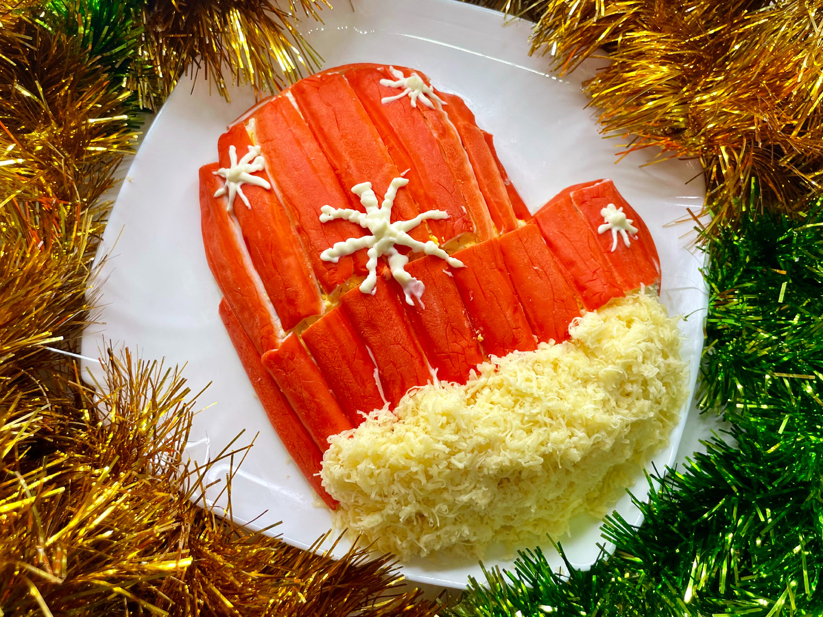 Собираем салат на плоском блюде, формируя силуэт варежки. Каждый слой аккуратно уплотняем и смазываем майонезом, чтобы напиток вкусов не разошёлся по краям. Верхний слой — красная сторона крабовых палочек, после чего поверхность посыпаем сыром и дополняем лёгким декоративным узором по желанию. Уменьшаем время охлаждения до часа — слои успевают схватиться и держать форму.
