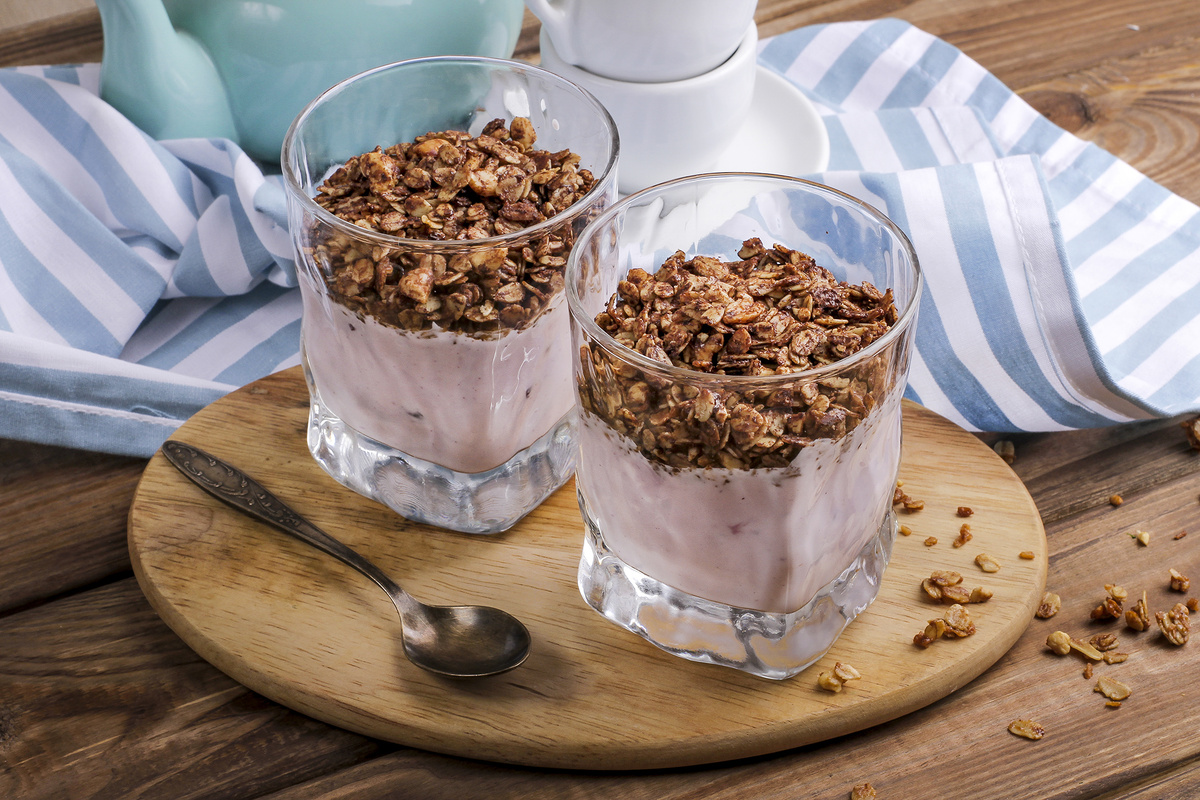 Для двух порций понадобятся 120 граммов шоколадной гранолы, 400 граммов йогурта и 50 граммов замороженной черники. Можно подстроить порции под свой аппетит и настроение утра.