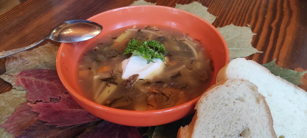 Сначала грибы замачиваются и варятся до мягкости, после чего в кастрюлю отправляются обжаренные лук, морковь и чеснок вместе с картофелем. Затем макаронные изделия добавляются так, чтобы они успели свариться синхронно с ломтиками картофеля. В конце — зелень и легкая сметанная заправка, которая завершает блюдо мягким кремовым оттенком.