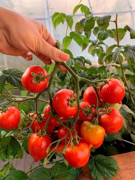 Сроки созревания — среднеспелые. В теплицах с продуманным микроклиматом плодоношение идёт волнами, что позволяет снимать урожай целыми кистями. Для достижения заявленной урожайности 20–25 кг с квадратного метра важно соблюдать режим полива и подкормок, особенно во время налива плодов массой 100–150 г.