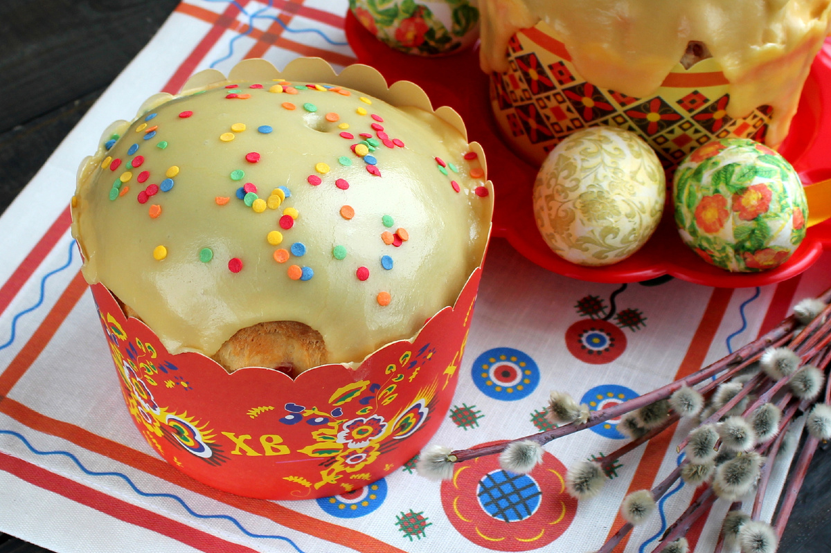 После подъёма тесто делят по формам на треть и отправляют в духовку, пока поверхность не зарумянится. Готовность проверяют деревянной палочкой. Остывшие куличи украшают глазурью или по желанию — так же просто, как и готовились.
